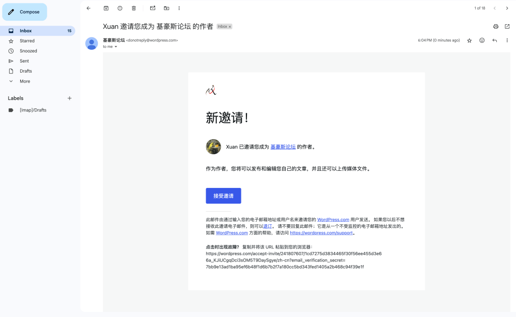 在您提交作者申请后,我们将给予回信。您需要先点击接受邀请。随后您可以选择从回信中的链接登录或注册Wordpress账号随后进入后台。