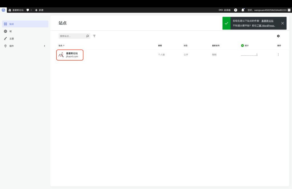 进入Wordpress后台后点击站点“基豪斯论坛”-jihao4.com 进入站点后台