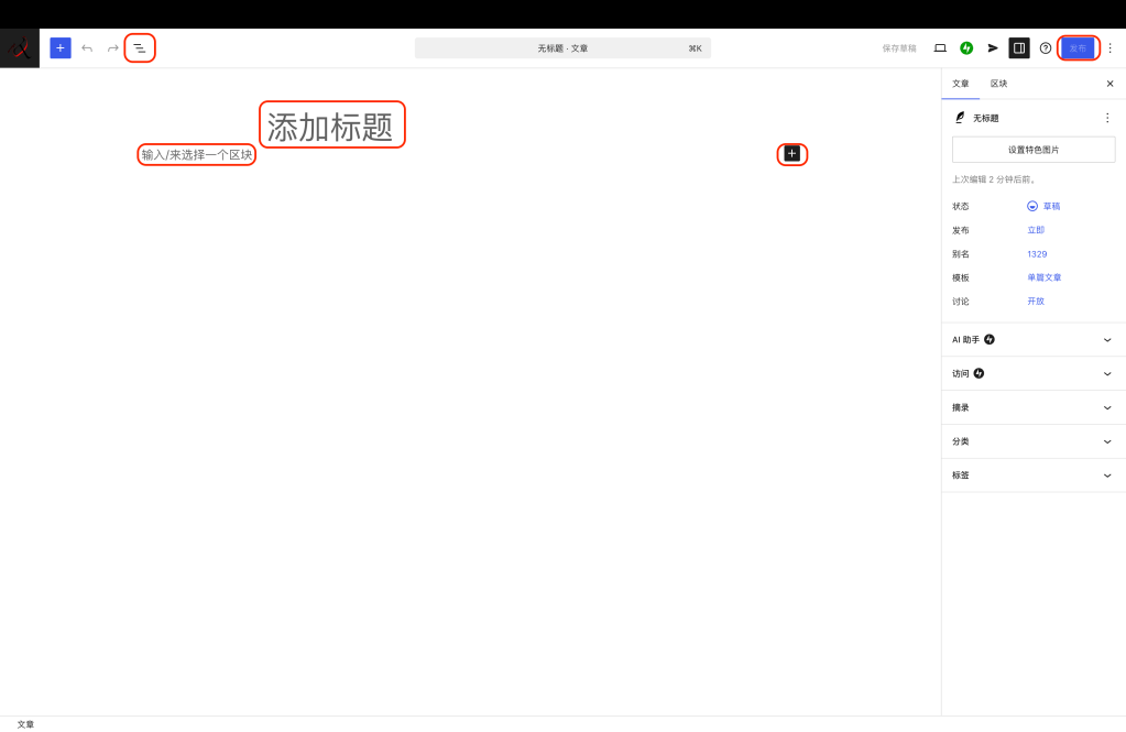 - 右方“文章”/“区块”栏目可以让您浏览和编辑您文章或当前区块的属性