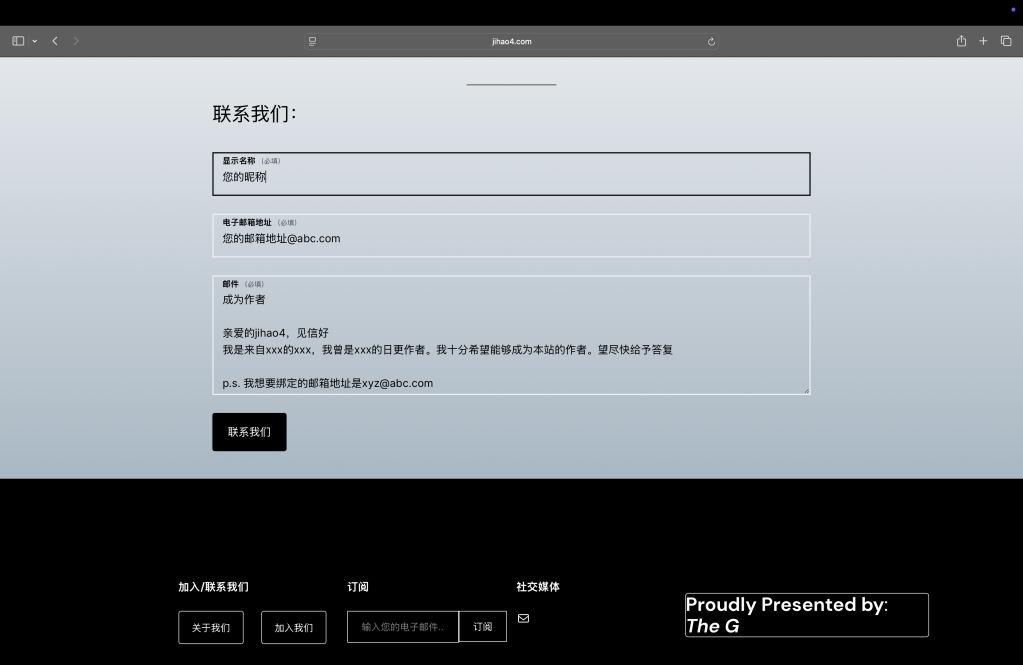 - 以“加入联盟”为标题,提交您的姓名或者昵称、想要绑定的邮箱地址、一段对于您立场的简短介绍。此外需要额外提供您的一篇文章以供联盟审阅。